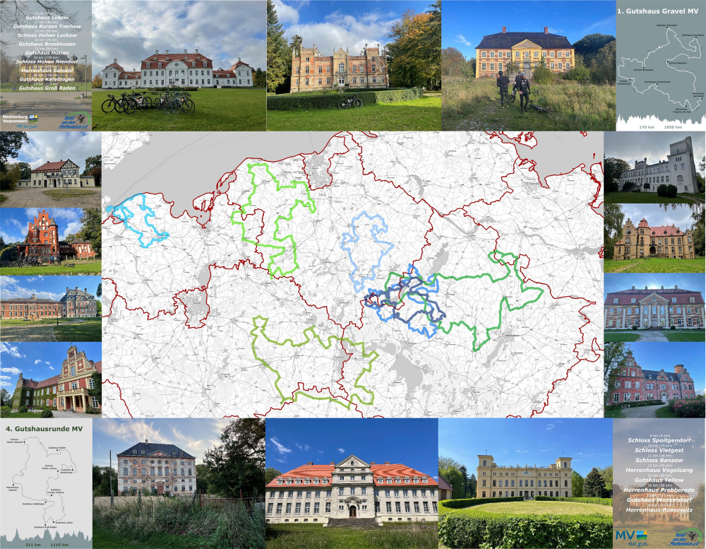 Nach kurzer Überlegung fiel die Entscheidung einstimmig auf die Gutshäuser, welche auch heute noch zahlreich von der landwirtschaftlichen Tradition Mecklenburg-Vorpommerns zeugen. Die Verknüpfung von Gutshaus und Radsport war dann auch schnell gefunden. Inspiriert durch den Stoneman, sollten die Gutshäuser als Stempelstellen dienen. So ging es ans Werk, Strecke, Gutshäuser und Kilometer geschickt zu kombinieren. Am Ende stand die erste Gutshausrunde als Gravelvariante von 170 km und 8 Gutshäusern bereit. Fünf wagemutige Pedalritter begaben sich am 24. Oktober 2020 bei trübem und feuchtem Herbstwetter auf den Kurs in der Mecklenburgischen Schweiz. Schnell zeigte sich, dass mancher Weg in der Karte in natura doch nicht mehr existiert. Fahrend, schiebend, tragend ging es von Gutshaus zu Gutshaus. Auf der Stempelkarte gab es Loch um Loch für jedes erreichte Herrenhaus. Nach 130 km kam die Dunkelheit und mit ihr die Kälte und Schneeregen. Ein Gutshaus fehlte noch, doch auch das wurde im Licht der Stirnlampe erreicht. Auf den letzten Kilometern hieß es nochmal „Wege finden im Dickicht“. Das Wegenetz in den Karten ist halt doch manchmal historisch. Am Ende standen 174 km und 1840 Höhenmeter bei der ersten Gutshausrunde auf dem Tacho. Fazit der ersten Tour: Strecke zu lang, Wiederholung unbedingt wünschenswert, Mecklenburg-Vorpommern hat sehr viele sehr sehenswerte unbekannte Landstriche. Nach der ersten Ausgabe folgten bis heute 6 weitere Gutshausrunden (3 Rennrad, 3 Gravel). Insgesamt wurden im Rahmen der Gutshausrunden bisher 60 Gutshäuser besucht. Die Gravelvariante findet immer Mitte Oktober statt und umfasst, abgesehen von der ersten Ausgabe, 130-150 km bei 7-8 Gutshäusern. Die Rennradausgabe findet in der ersten Maihälfte statt und umfasst 200-220 km bei 9-10 Gutshäusern.